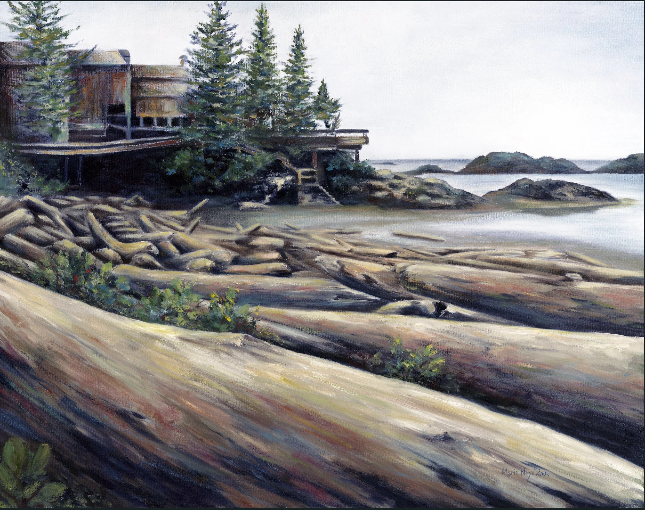 The Shores of Vancouver Island are rugged and filled with large Logs from storms that bring them to shore. Long Beach is over 12 miles long and a treat to walk. Enjoy Marie’s Art for many years to come by purchasing a painting or canvas print. We can ship World Wide.